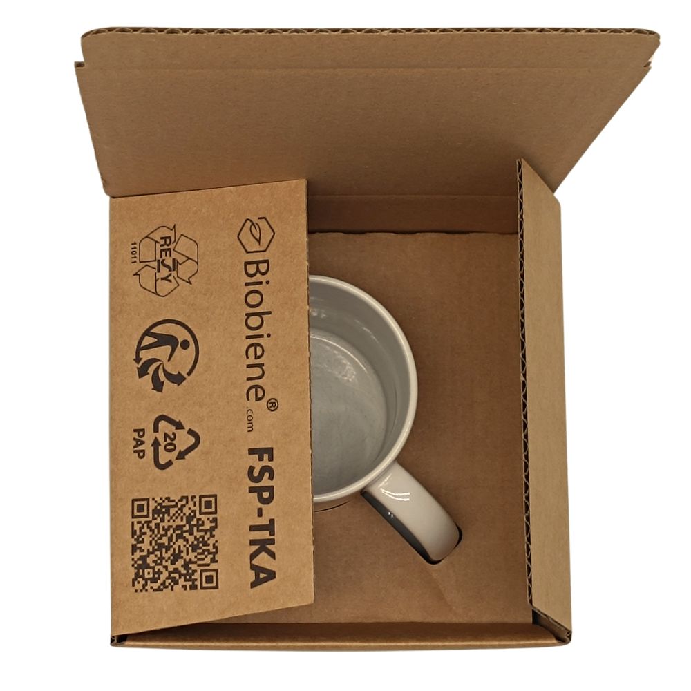 Wir liefern Ihnen mit dem Automatik-Tassenkarton FSP-TKA ein plastikfreies Verpackungsmaterial, dass in Deutschland produziert wurde.